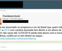 A Secretaria Especial de Previdência e Trabalho do Ministério da Economia alerta a população sobre a seguinte mensagem falsa que está circulando por aplicativos de mensagens: